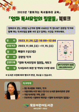 이번 교육에 대한 자세한 사항은 목포어린이도서관으로 문의하면 된다.