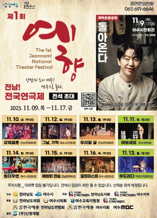 오는 9일부터 17일까지 여수시민회관과 진남문예회관, 학생교육문화회관에서 열리며 공연 관람은 무료다. 관람권은 가까운 읍면동이나 여수시 문화예술과에서 받을 수 있다.