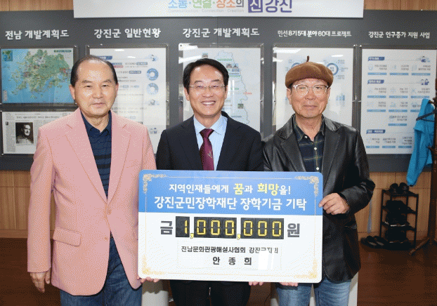 전남문화관광해설사협회 강진군지회 안종희 회장은 “강진의 문화관광 발전을 위한 관심과 성원을 아끼지 않는 군민들에게 감사한 마음을 전달하고자 장학금을 기탁했다”며 “학생들이 더 나은 교육 환경에서 성장해 나갈 수 있었으면 좋겠다”고 말했다.