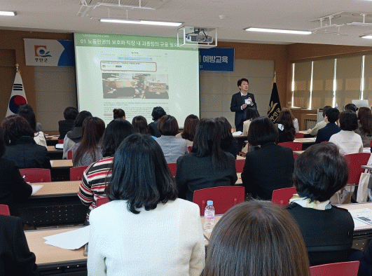 이날 교육은 고용노동부에서 지원하는 직장 내 괴롭힘 예방교육 전문 노무사를 초빙해 ‘조직문화 개선 및 안전한 근무환경 조성’이란 주제로 직장 내 괴롭힘 개념과 어린이집 내에서 발생할 수 있는 괴롭힘 사례 및 대처방법 등에 대해 진행됐다.