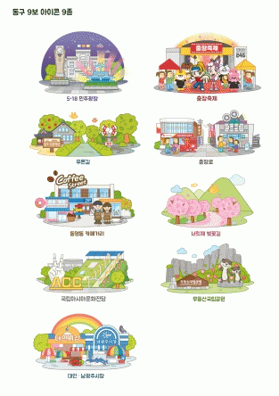 ‘동구 9보’의 개별 아이콘은 관내 산재한 국립아시아문화전당, 동명동 카페거리, 푸른길 등 내로라하는 다수의 역사 문화 자원을 한데 묶어 시민과 외지 관광객들에게 동구의 대표 관광 콘텐츠를 효과적으로 홍보하기 위해 제작됐다.