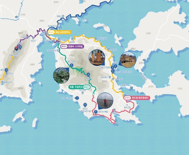 완도 남파랑길 코스는 총 세 구간으로 나뉘는데 86 코스(24.5km)는 옛 남창교에서부터 청해진 유적지를 지나 완도해조류센터까지, 87 코스(18km)는 완도 해조류센터에서 완도타워, 정도리 구계등, 화흥초등학교에서 끝난다.