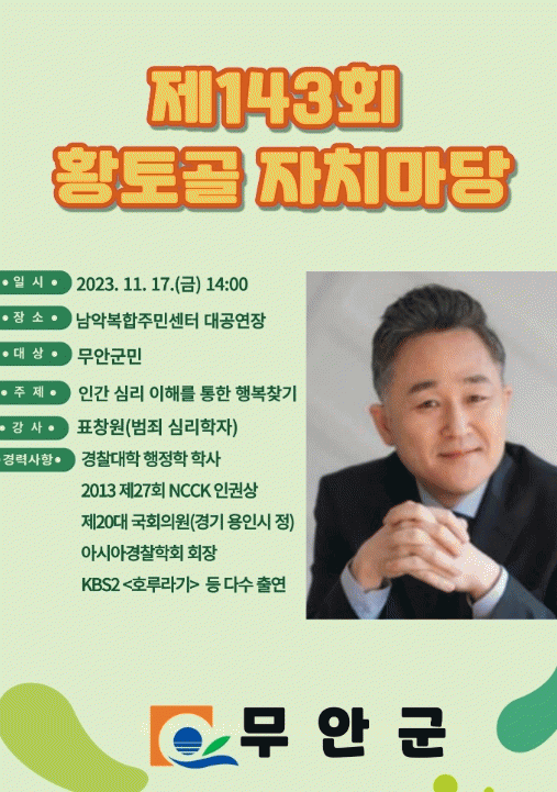 김산 무안군수는 “무안YD페스티벌 개막 행사에 맞춰서 진행되는 황토골 자치마당에서 특별한 강사님을 모시고 강연을 진행하는 만큼 많은 분들이 이 기회를 놓치지 않기를 바란다”고 말했다.