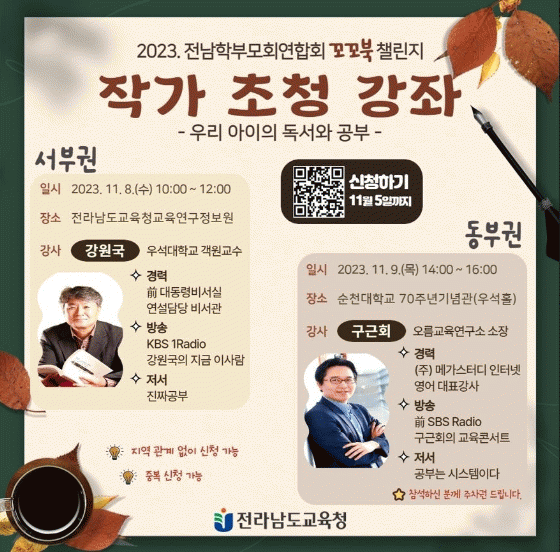 최효진 전남학부모회연합회장은 “지난 8월부터 시작한 꼬꼬북 챌린지를 홍보하고 더 많은 학부모들에게 독서의 중요성을 알리고자 이번 강좌를 전남교육청과 함께 개최했다.”며 “이번 강좌를 통해 전남에서 학교, 학생, 학부모가 함께하는 독서교육이 활성화되면 좋겠다.”고 말했다.