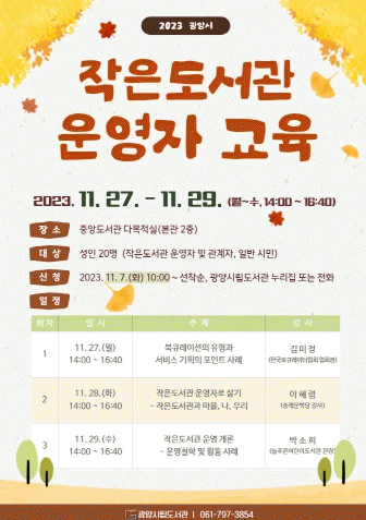 이번 교육은 20명 내외로 선착순 모집하며, 작은도서관 운영자와 관계자 외에도 도서관과 책에 관심이 있는 일반 시민도 참여할 수 있다.