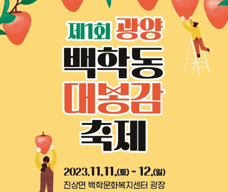 광양 진상면 백학문화복지센터 광장 일원에서 열리는 ‘제1회 광양백학동대봉감축제’는 11일과 12일 이틀에 걸쳐 ‘백운산의 정기로 키워낸 대봉감, 가을의 끝자락을 수놓다’라는 주제로 시민과 관광객을 기다린다.