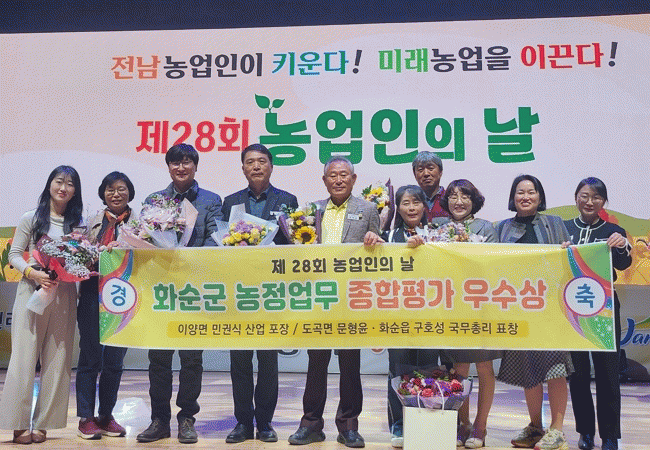 이날 기념식에서는 농업인의 날 기념 유공자 분야 수상도 같이 이뤄졌는데, 화순군 이양면 초방리농장 민권식 대표가 산업 포장을, 도곡파프리카영농조합법인 문형윤 대표, 쌀전업농화순군엽합회 구호성 회장이 각각 국무총리 표창의 영예를 안았다.
