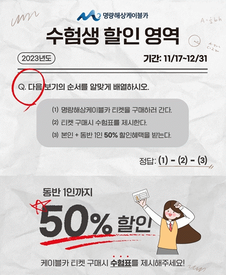 이번 수험생할인 이벤트는 명량해상케이블카를 이용하는 모든 수험생들에게 제공되며, 매표 시 수험표를 제시하면 본인과 동반 1인까지 케이블카 이용요금의 50%를 할인을 받을 수 있다.