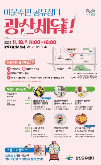광산구 관계자는 “이번 공유장터는 주민이 직접 참여해 공유활동을 경험하는 뜻깊은 자리가 될 것”이라며 “앞으로도 민?관?산?학의 다양한 분야와 협력적 공유 공동체를 확립해 공유가 일상이 되고, 시민의 삶이 이로워질 수 있도록 광산공유센터와 함께 최선을 다하겠다”고 전했다.