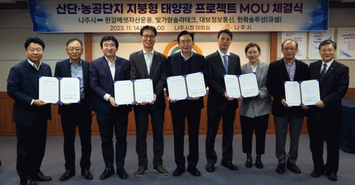 나주시는 전날 시청사 이화실에서 한강에셋자산운용(주), 대보정보통신(주), 한화솔루션(주), 빛가람솔라테크(주) 등 4개사와 ‘산단·농공단지 지붕형 태양광 프로젝트’ 업무협약을 체결했다고 15일 밝혔다.