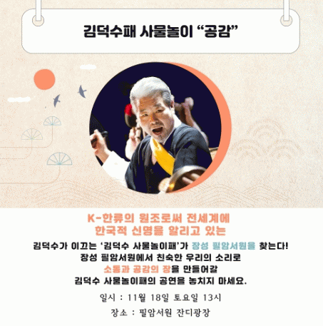 김한종 장성군수는 “세계유산 필암서원에서 펼쳐지는 이번 공연이 서원의 역사?문화적 가치를 널리 알리는 계기가 될 것”이라며 “아름다운 가을 풍경을 자랑하는 필암서원에서 전통음악의 매력을 한껏 만끽해 보시기 바란다”고 말했다.