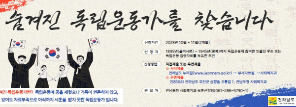 곽영호 전남도 사회복지과장은 “전남도 대표 민간 기업과 협력해 큰 성과를 거두고 있다”며 “의향 전남의 정체성을 찾는 독립운동가 발굴 캠페인 전개로 국가유공자 예우 문화가 확산되길 기대한다”고 말했다.
