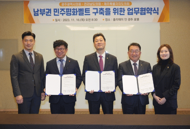 민주평화벨트 협약을 처음 제안한 정다은 5·18특위위원장은 “국가폭력의 아픔을 외면하는 민주주의는 의미가 없다고 생각한다”며 “오늘의 연대가 큰 힘을 발휘할 것으로 믿으며 광주·제주 국립트라우마센터 개원 등 공동대응 가능한 일부터 함께해나가자”고 말했다.