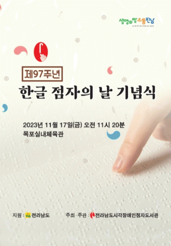 행사는 시각장애인으로 구성된 공연단의 축하공연을 시작으로, 점자 발전 유공자 시상, 우리말 바로 알기, 시각장애인 점자 받아쓰기, 백일장 대회 등 다채로운 도민 참여 프로그램으로 진행된다.
