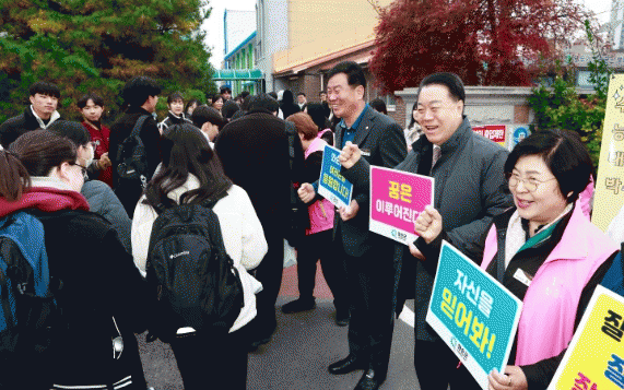 구복규 군수는 ′꿈은 이루어진다′는 문구가 적힌 손팻말을 들고 수험생들이 시험장에 도착할 때마다 ′화이팅′을 외치며 “열심히 노력한 만큼 좋은 결과가 있기를 바란다”라고 격려했다.