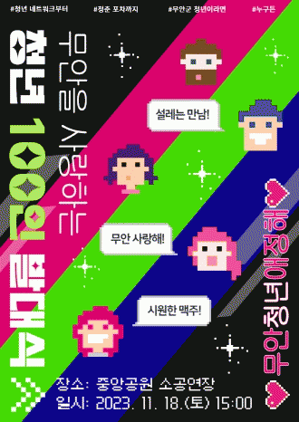 ‘무안을 사랑하는 청년 100인’이란 무안에서 활동하는 청년들이 지역 애착감을 강화하고, 청년 리더로서 성장, 청년정책 제안 활성화, 지역사회와의 연결 강화 등을 할 수 있도록 새로운 의미를 부여하는 행사이다.