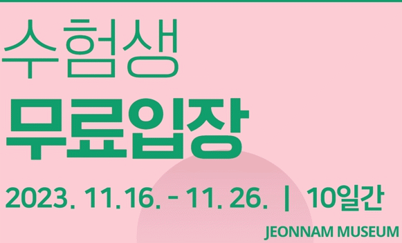 이지호 도립미술관장은 “그동안 시험 준비로 지친 학생들에게 조금이나마 머리와 마음이 쉴 공간이 되도록 무료입장 이벤트를 마련했다”며 “전남도립미술관이 수험생들에게 작은 휴식처가 되길 바란다”고 말했다.