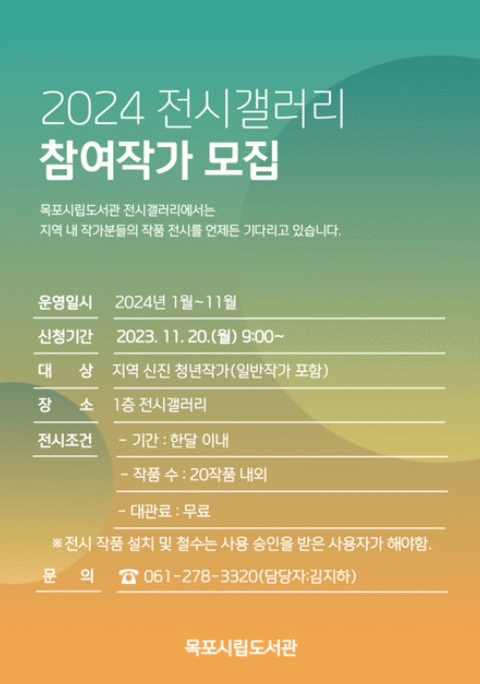 목포시립도서관은 내년 한해 동안 지역 신진 청년작가의 작품을 전시해 작가와 지역을 알리고 창작 활동을 독려하여 성장할 수 있는 계기를 마련하고 다양한 전시연계 프로그램 활성화로 고품격 문화서비스를 제공할 예정이다.