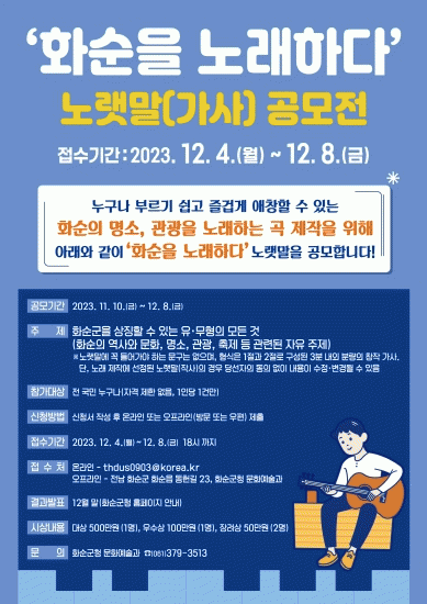 이번 공모는 화순의 명소, 관광을 노래하는 곡 제작을 위한 노랫말(가사) 공모로 화순군에 대한 국민의 관심도를 제고하고 시책을 알리기 위해 추진한다고 밝혔다.