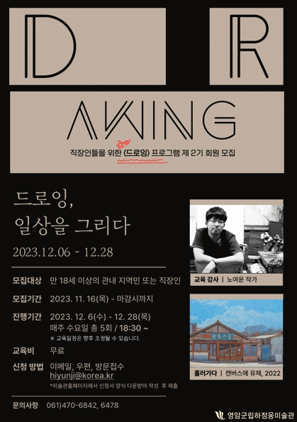 2기 드로잉 수업도 노여운 작가가 진행한다. 노 작가는 평범한 골목길, 사람들의 흔적을 자신만의 색으로 표현하며 일상의 공간에 활력을 불어넣는 작품활동을 이어가고 있다.