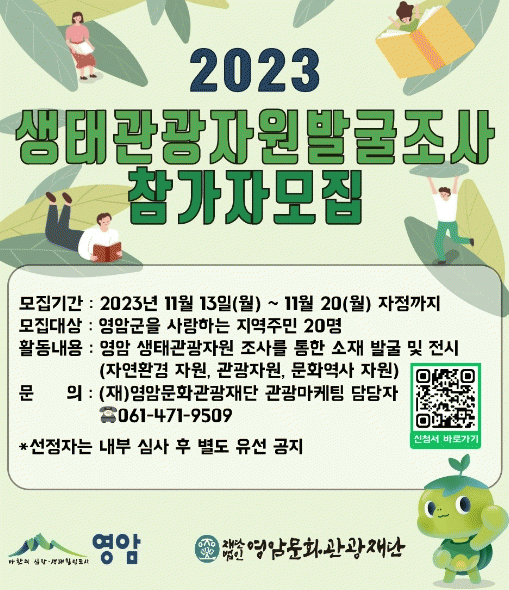영암문화관광재단은 “자원조사발굴을 통한 영암의 자연환경 자원, 관광자원, 문화역사자원을 발굴하여 생태힐링도시로서 영암 생태관광산업 발전에 기여하도록 노력하겠다“고 전했다.