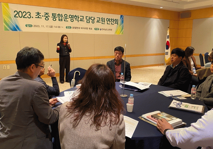 이번 연찬회는 초,중통합운영 연구학교인 진월초.광양진월중학교의 운영사례를 나누고, 2024학년에 학교별로 적용할 지원 자료 프로그램을 컨설팅하는 순서로 진행됐다.