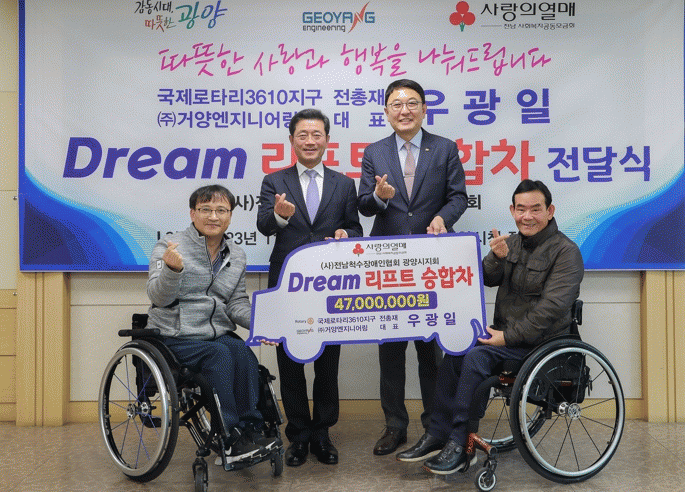 이날 전달식에는 정인화 광양시장, 우광일 ㈜거양엔지니어링 대표, (사)전남척수장애인협회 광양시지회 지회장 직무대행 송규향 부회장, 국제로타리 3610지구 및 (사)전남척수장애인협회 관계자 등이 참석했다.