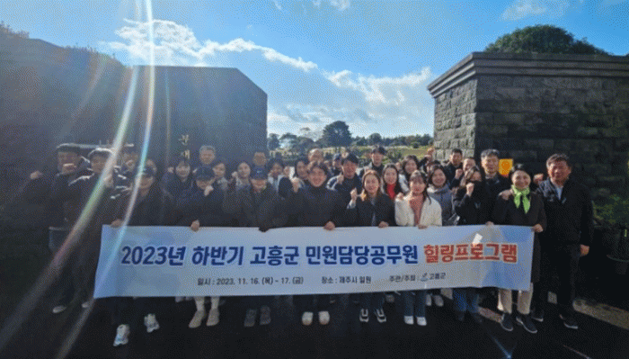 이번 힐링 프로그램은 전문교육 업체를 통하여 제주도의 아름다운 자연경관 산책, 승마공연 등 지역 문화, 지역 특색 음식 등 평소 접하기 힘든 색다른 체험으로 구성하여 민원 담당 공무원의 지친 몸과 마음에 활력을 불어넣는 시간을 가졌다.