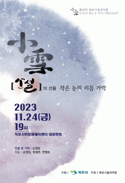 이번 공연은 ‘小雪(소:설)의 선율’을 주제로 총 2부로 구성되며 1부에서는 시립국악원생들의 북의 울림을 시작으로 남도민요, 대금과 가야금의 만남 등 가(歌),무(舞),악(樂)이 함께하는 공연을 선보인다.