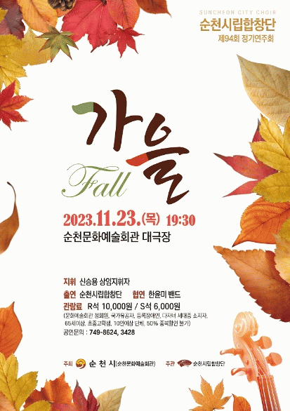 순천문화예술회관 관계자는 “순천시립합창단의 공연을 통해 늦가을의 정취를 감미롭고 감성 풍부한 재즈 음악과 함께 즐기는 추억으로 간직하시기를 바란다.”고 전했다.