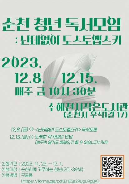 시는 순천시에 거주하는 청년(20세~39세) 10명을 대상으로, 수해전시작은도서관(순천시 우석1길 17)에서 12월 8일과 15일 양일간 독서모임을 운영한다.