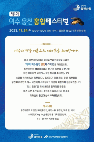 여수 웅천계(김채관 계장)가 주최하는 이번 행사는 전남어촌특화지원센터의 지원을 받아 웅천 특산품인 굴, 홍합 등을 활용한 다양한 음식과 상품들을 선보인다.