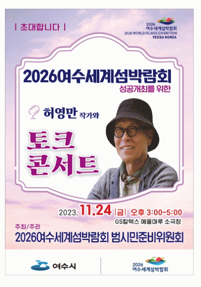 여수시 홍보대사인 허영만 작가와 함께 섬전문가, 시민들이 ‘섬, 바다와 미래를 잇다’라는 2026여수세계섬박람회의 주제로 자유롭게 대화하는 이야기 마당으로 펼쳐진다.
