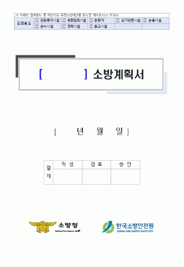 작성 방법은 목포소방서 홈페이지 자료실-자주 찾는 서식 또는 한국소방안전원 홈페이지 팝업창 특정소방대상물 용도별 소방계획서(10종) 작성 안내를 통해 구체적인 내용을 확인할 수 있다.