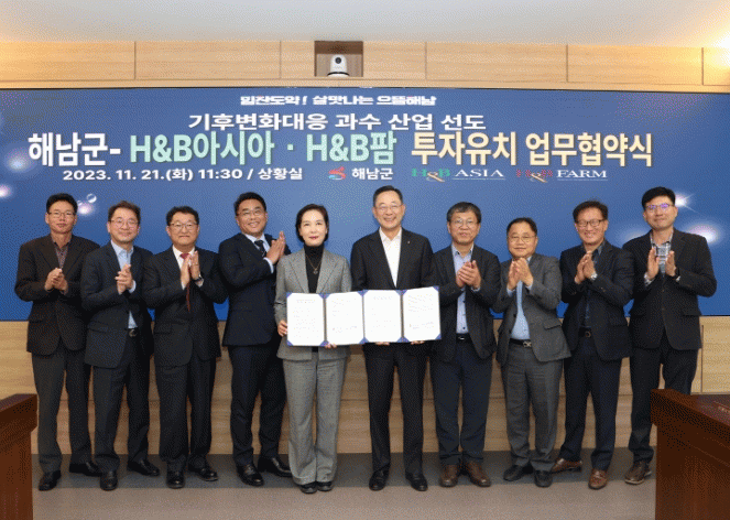협약식에는 명현관 해남군수, H&B아시아·H&B팜 김희정 대표이사, 박주현 전무가 참석해 해남군 기후변화대응 과수산업 선도를 위한 협력관계를 구축하기로 했다.