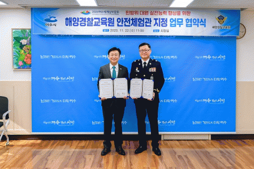 시에 따르면 이날 시장실에서 해양경찰교육원과 민방위 대원 실전능력 향상과 시민들의 생명을 보호하기 위해 업무 협약을 체결했다.