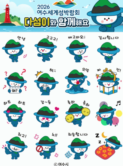 시 관계자는 “귀여운 이미지의 다섬이가 2026여수세계섬박람회를 일반 대중에게 알리는 역할을 해주고 있다”며 “앞으로도 이모티콘 추가 무료 배포를 통해 많은 분들에게 섬박람회를 알리고, 인지도를 높여나가겠다”고 말했다.