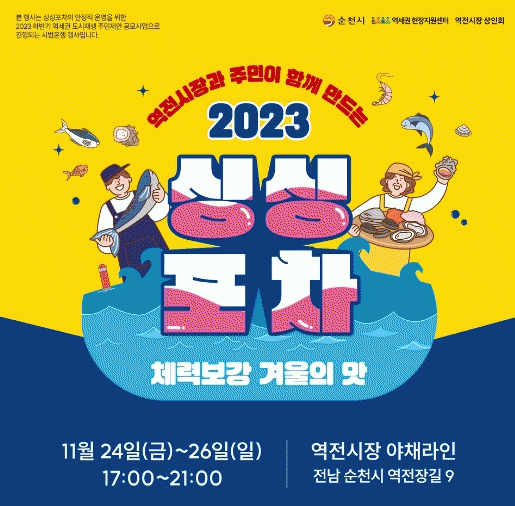 역전시장 야채점포 일대(역전장길 9)에서 진행하는 이번 행사는 전남 동부권 수산물 최다 집결지로서 신선한 제철 식재료를 저렴하게 구매할 수 있는 역전시장의 장점을 살려 구매한 해산물을 즉석에서 숯불에 구워 먹을 수 있도록 했다.