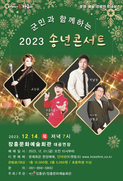 ‘송년콘서트’는 12월 1일(금) 오전 10시부터 장흥문화예술회관 현장예매와 인터넷 티켓링크를 통해 예매가 가능하다.