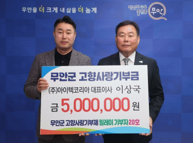 이날 군수실에서 열린 고향사랑기부 릴레이 캠페인에 ㈜아이텍코리아 이상국 대표이사가 이호성 무안군의원의 소개로 20호 주자로 참여함에 이어 한양공영㈜의 김정훈 대표이사가 임현수 무안군의원의 소개로 21호 주자로 잇따라 참여하며 훈훈함을 더했다. 릴레이 20호, 21호 참여자는 기부금 500만 원씩을 흔쾌히 기탁하며 고향사랑기부금 모금 활성화에 크게 힘을 보탰다.
