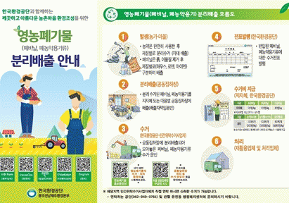 배출 가능한 영농폐기물은 폐비닐(하우스비닐, 멀칭비닐 등), 폐농약용기류(유리·플라스틱·봉지류)에 한하며 폐차광막, 폐부직포, 폐반사필름 등의 영농폐자재는 마을별 클린하우스에 일반 재활용품으로 분리배출하거나 종량제봉투에 담아 배출해야 한다.