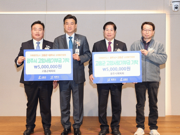 군에 따르면 지난 23일 고흥군 썬밸리리조트에서 개최된 고흥군·광주시 체육회 친선 체육교류 전 환영식에서 고흥군체육회와 광주시체육회 회원들이 자매결연도시의 상생발전을 응원하는 마음을 담아 고향사랑기부금을 상호 기탁했다.
