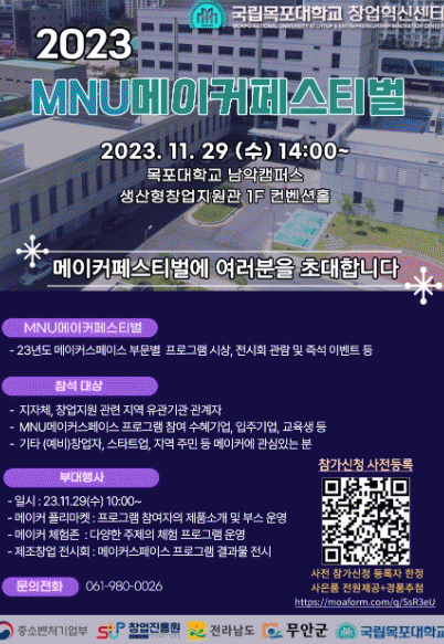 행사는 목포대학교 남악캠퍼스 생산형 창업지원관에서 오전 10시부터 오후 5시까지 진행되며, 대학생과 지역주민들도 참여할 수 있는 전시회, 벼룩시장 및 체험부스 등의 각종 부대행사도 함께 운영된다.