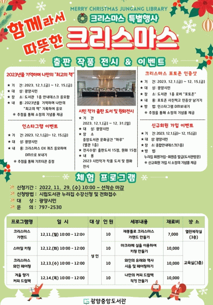 크리스마스 시즌을 맞아 도서관을 찾는 시민들에게 체험 프로그램과 다양한 이벤트를 통해 즐거움을 선사하고 2023년 탄생한 시민작가들의 출간작품과 원화를 전시해 풍성한 볼거리를 제공할 계획이다.