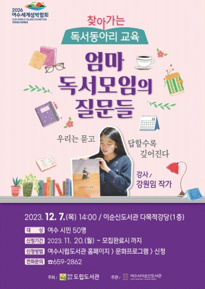 강연은 무료이며, 독서동아리 회원뿐만 아니라 독서동아리에 관심이 많은 여수 시민 누구나 여수시립도서관 홈페이지 전화 등을 통해 신청 가능하다.