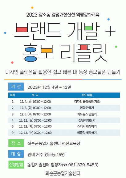 이번 강소농 역량 강화교육은 오는 4일부터 13일까지 매주 월~수요일 오전 9시부터 12시까지 총 6회에 걸쳐 농업기술센터 1층 전산 교육장에서 진행된다.