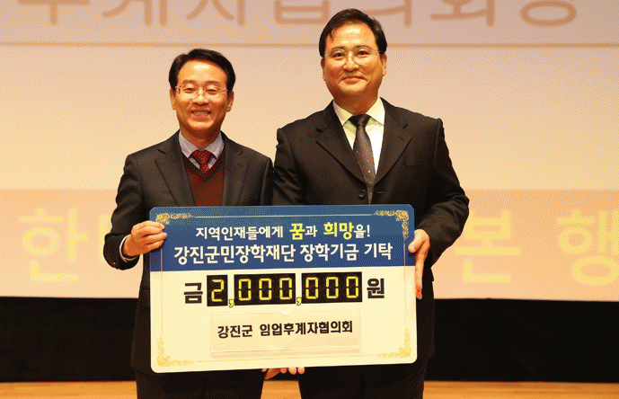 강진군 임업인후계자협의회는 2018년부터 임업인 한마음대회를 통해 장학금을 기탁해왔으며, 올해에도 2백만 원을 쾌척하여 총 6백만 원의 장학금을 기탁했다.
