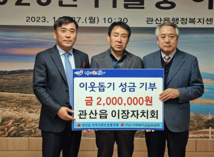 김대중 관산읍장은 “항상 관산읍의 발전과 안녕을 위해 수고하시는 각 마을 이장님들께 감사드린다”며“기부하신 성금은 지역의 어려운 이웃들을 위해 소중히 쓰도록 하겠다”고 말했다.