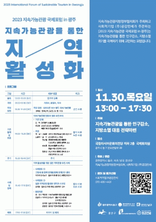 ‘지속가능지방정부협의회’와 광주 동구·서구·남구·광산구가 공동 주최하는 이번 포럼은 ‘지속가능관광을 통한 지역 활성화’를 주제로 지속가능관광을 바탕으로 인구감소와 지방소멸 위기를 극복하기 위해 고민하는 자리가 될 예정이다.