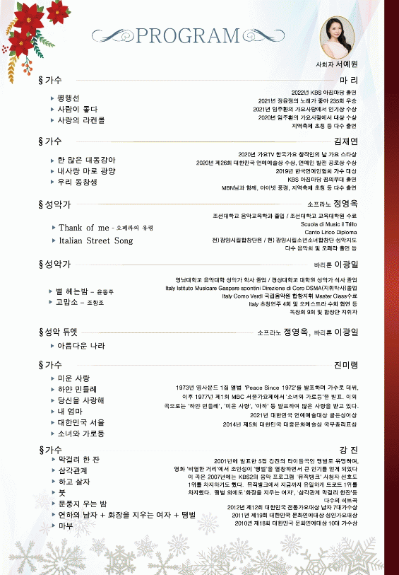 이번 송년 콘서트는 시민들에게 다사다난했던 2023년 한 해를 차분히 정리하며 유종의 미를 거둘 수 있는 감성과 에너지를 충전해 드리기 위해 마련됐다.
